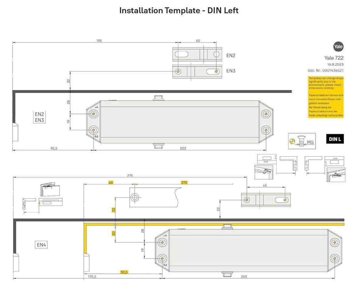 The YALE 722 Pro OVERHEAD DOOR CLOSER is a reliable and easy-to-install solution for controlling door movement. Designed for both left and right doors, it ensures a smooth and gentle operation without the need for batteries, making it an eco-friendly choice for any professional setting.